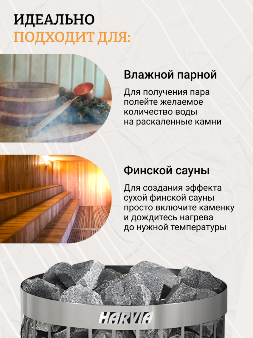 Компактная и эргономичная конструкция печи делает ее удобной в установке и обслуживании. Harvia Cilindro PC 70 идеально подходит для домашнего использования, а также для коммерческих саун и спа-центров.